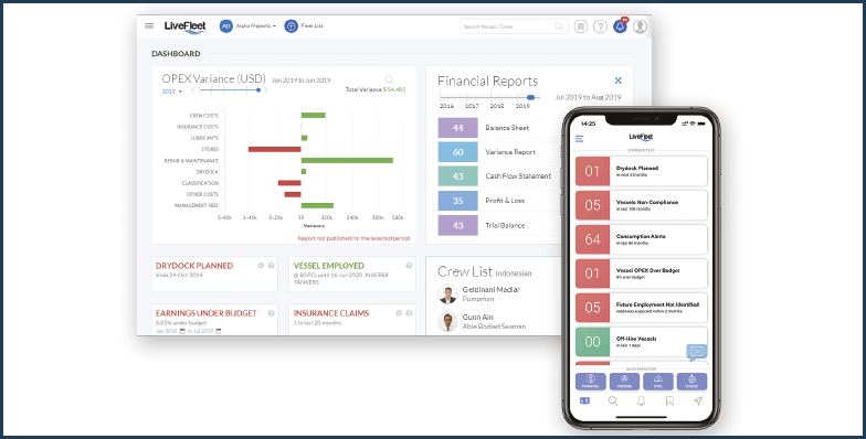 - Vessel monitoring: LiveFleet mobile allows users to pinpoint a vessel’s current location, view key performance metrics, monitor upcoming activities, and access essential operational information and financial reports.