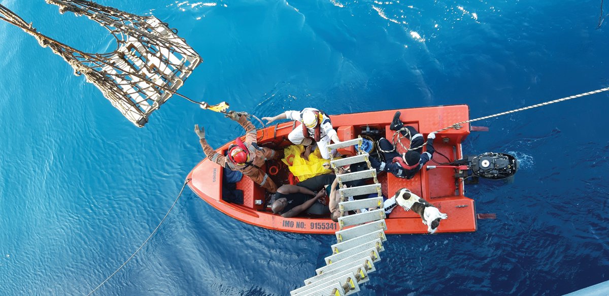 The BSM crew pulled three lucky survivors and one dog from the water. The captain of the fishing vessel ‘Dumbo Jumbo’ was suffering from hypothermia and unable to move, so was lifted by Johann Schulte’s cargo net and transferred to the ship’s hospital for urgent treatment. Warm clothes and food were offered to the rest of the survivors by the BSM crew. After 20 min on board, a helicopter from Spain reached the vessel’s location and transferred the Spanish fishing boat’s crew to land for medical treatment.