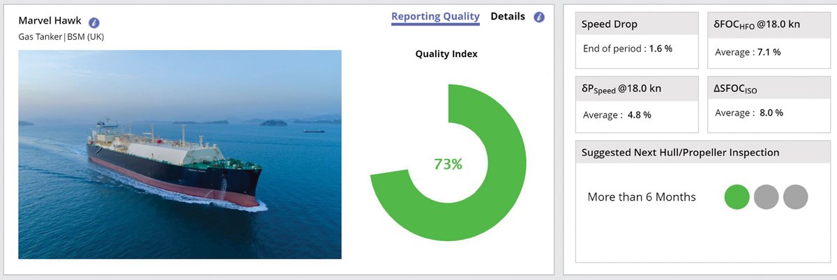 “Since the introduction of the Performance module to our enterprise resource planning system SmartPAL, the hull condition of all our ships is monitored through their daily logs. We follow the digital twin methodology whereby the reported performance is normalised in terms of speed, draught, weather and fuel and benchmarked against each ship’s individual newbuilding state,” explains Frank Paleokrassas, Fleet Performance Manager at BSM. “By monitoring the long-term trend development of the speed drop, we can see where the ship currently stands compared to when it last left drydock. When the speed drop reaches 10% a hull inspection is recommended.”