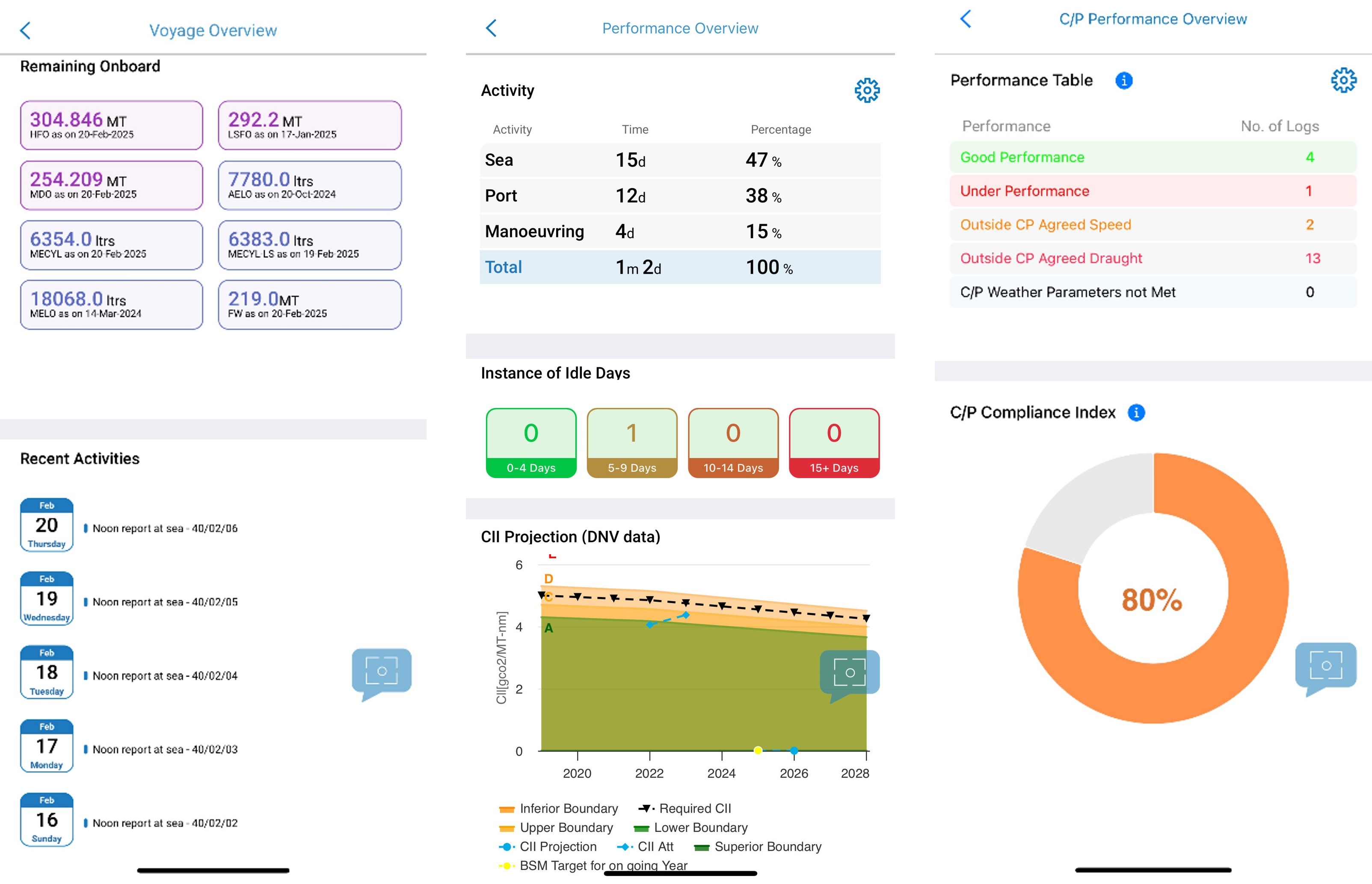 This section provides valuable insights into vessel performance, including speed and fuel consumption, main engine efficiency, emissions, and environmental footprint. It also compares these metrics against key indices such as the IMO’s Energy Efficiency Operational Indicator (EEOI) and Carbon Intensity Indicator (CII), as well as the vessel’s performance as per the charter party conditions.