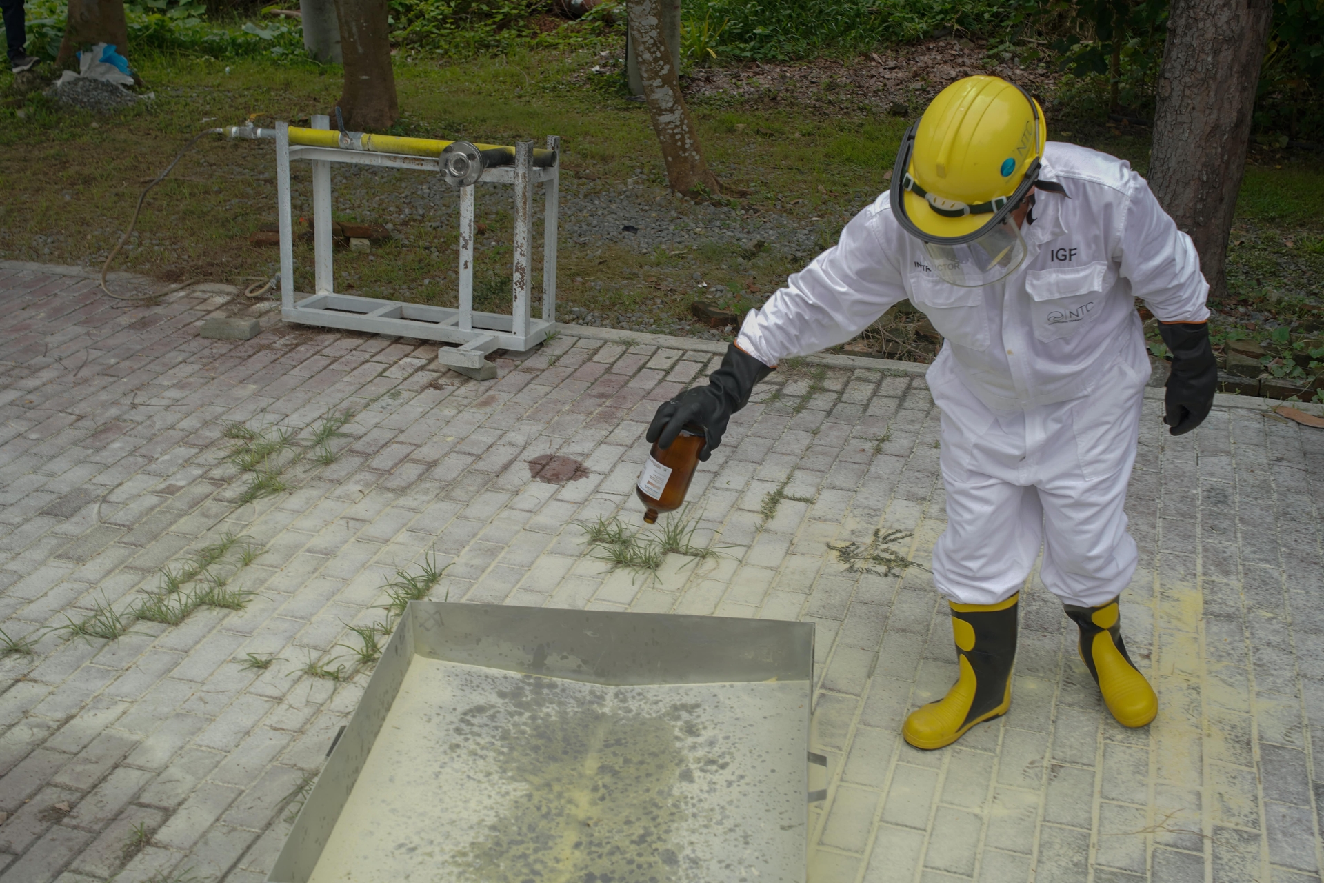 Participants also gain hands-on experience with alcohol-resistant foam, dry chemical powder (DCP), CO₂ systems, and water curtains – essential tools for managing methanol-related fire hazards.